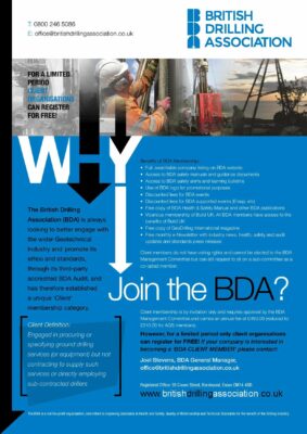 Against this backdrop, the BDA has created a unique ‘Client’ membership category, a category that the BDA defines as ‘an organisation engaged in procuring or specifying ground drilling services (or equipment) but not contracting to supply such services or directly employing sub-contracted drillers’.